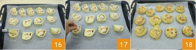 Brush the surface of the snails with the milk and beaten egg emulsion 16, sprinkle with poppy seeds 17, and bake in a preheated static oven at 355°F for 25 minutes (or in a convection oven at 320°F for 15-20 minutes) until the bites are golden. Your bread snails filled with ham and fontina are ready 18 to be served!