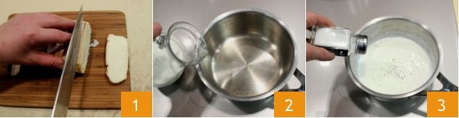 To prepare the breadsticks with black pepper fondue, start with the fondue: slice the taleggio 1 and then cut it into coarse cubes. In a large saucepan, pour the milk 2, then add salt 3 and pepper to taste.