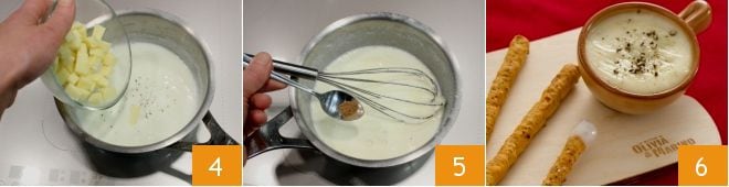 Heat the milk, then add the diced taleggio 4 and cook over low heat, stirring with a whisk until a cream forms. Just before turning off the heat, add a bit of nutmeg 5. Then transfer your black pepper fondue into small glasses or terracotta dishes and serve with the breadsticks 6!
