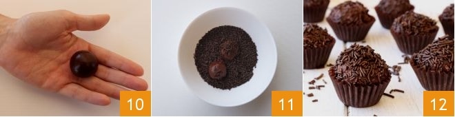 Form into balls 10 and roll them in a small bowl with chocolate sprinkles 11. Gradually place the balls in paper liners and serve the brigadeiro 12.
