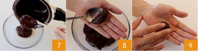 Transfer the mixture into a bowl 7 and let it cool to room temperature. Take about 1 tablespoon of the mixture 8 and roll it between your slightly buttered hands 9: with these amounts, you'll get about 20 sweets.