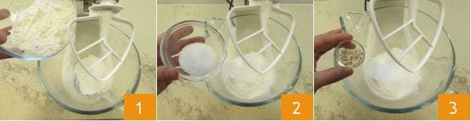 To prepare the pan brioche swirls, start by making the basic dough. In the bowl of a stand mixer fitted with a paddle attachment, first add the flour 1, then the sugar 2, and the crumbled yeast 3.