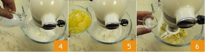 Start working the mixture at moderate speed. Add the milk 4 and, as soon as it is completely absorbed, also incorporate the slightly beaten eggs 5. Add the salt 6 and continue to work at medium speed.