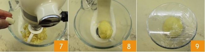 At this point, add the softened butter little by little 7, waiting for each piece to be absorbed before adding the next, and work until the dough is smooth and compact 8. The dough processing with the mixer will take about 15-20 minutes. Then transfer it to a bowl, cover with plastic wrap 9, and let rise for at least an hour.