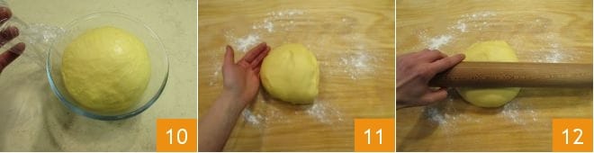 As soon as the dough has doubled in volume, remove the plastic wrap 10 and transfer it to a lightly floured work surface 11. Begin to roll it out with a rolling pin 12