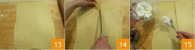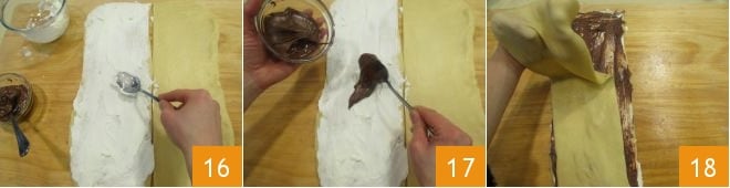 and spread it over the entire surface using the back of a spoon 16. Do the same with the Nutella, spreading it over the layer of cream cheese 17. Then gently and quickly lift the second strip of dough and place it on top 18.