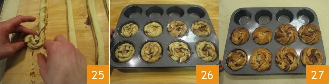 After twisting them, roll them up as if they were swirls 25. Gradually transfer them into the muffin tin 26 and bake in a preheated static oven at 355°F for about 20 minutes on the lower rack. Remove from the oven 27 and enjoy your pan brioche swirls!