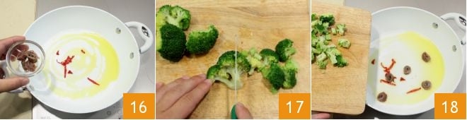 In a pan, pour the oil and sauté the half garlic clove over low heat, being careful not to burn it. As soon as it is golden, remove it and add the chopped fresh chili pepper and anchovy fillets drained from the preserving oil 16. Then chop the blanched broccoli florets 17 and add them to the anchovies 18.