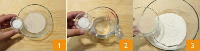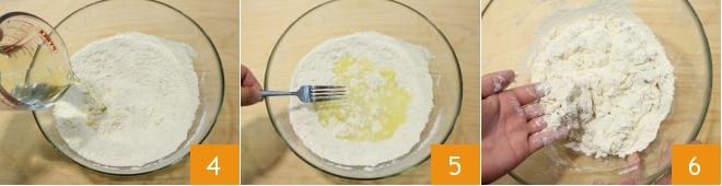 Also add the water in which you dissolved the salt 4 and the oil, then mix first with a fork 5, then when the liquids are absorbed, start kneading vigorously in the bowl 6.