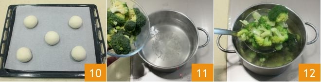 Shape each part into a ball. Place the dough balls on a baking sheet lined with parchment paper, spaced well apart 10, and let them rise in a turned-off oven with the light on or covered with a cloth and a blanket, until they double in size (it will take about 2 hours). Meanwhile, focus on the filling: wash the broccoli and detach the florets from the main stem. Blanch the broccoli in lightly salted boiling water for a few minutes to soften them 11, then drain them with a slotted spoon 12.
