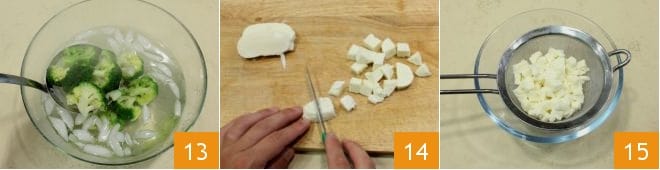 And immerse them in a bowl with ice water 13: in this way, as they cool, they will not lose their bright color. Take the mozzarella, cut it into small cubes 14, and let it drain 15 to remove excess whey.
