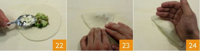 Place a generous spoonful of filling in the center 22. Close the panzerotto, forming a half-moon, and seal the edges well by pressing with your fingers 23, then the dough around the filling 24.
