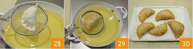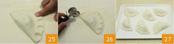 Press along the entire edge with your fingers to create the typical wavy decoration of panzerotti 25, then cut away the excess dough with a fluted pastry cutter to finish it better 26. Once ready 27