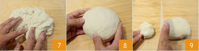 Transfer the dough to a lightly oiled work surface and continue working it 7 to obtain a smooth and soft dough 8. Divide the dough into 10 parts, each weighing about 2.8 oz 9.