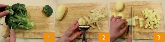 To prepare the broccoli burger, detach the florets from the main stalk of the broccoli 1, then wash them and cut the florets in half. Peel the potatoes 2 and cut them into cubes of the same size if possible 3