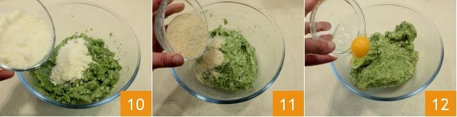 Wait for the mixture to cool, then add the grated Parmesan 10, breadcrumbs 11, and knead. Then also add the egg 12
