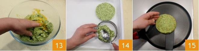 and knead again to combine it 13, then divide it into four parts. Form the burgers by placing a pastry ring with a diameter of 5 inches on a tray lined with parchment paper and filling it with the mixture to give the burgers a defined shape 14. Heat a non-stick skillet and cook the burgers a few minutes per side 15,