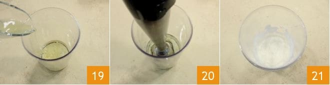 Add the equivalent of a tablespoon of lemon juice 19 and a pinch of salt, and blend everything with an immersion blender 20 until you obtain a smooth and sufficiently thick cream 21.