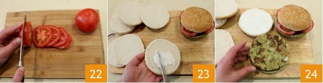 Slice the vine tomatoes 22 and hamburger buns. Then spread the mayonnaise on both halves of the buns 23, place the broccoli burger 24,