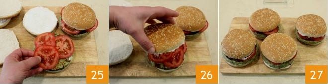 the tomato slices 25, and close with the top half of the bun 26. Your broccoli burgers are ready to be served 27!
