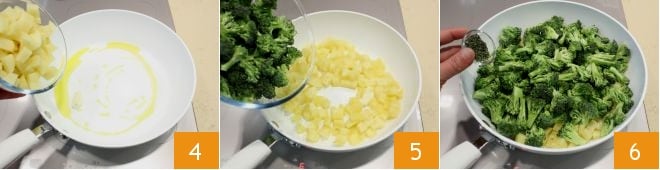 In a skillet, pour a drizzle of oil and brown a garlic clove (you can remove it later); add the potatoes 4 and cook them over medium heat for 5-10 minutes. Then also add the broccoli 5, salt and pepper to taste, and add chopped marjoram 6.