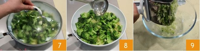 Cover with the lid 7; add the Vegetable broth from time to time to aid cooking 8; let it cook for at least 20 minutes or until both the potatoes and broccoli are soft. Once the vegetables are cooked, pass them through a food mill and collect the puree in a bowl 9.