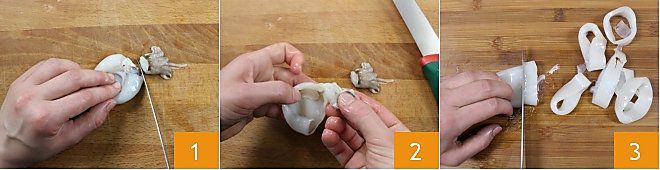 To prepare the Fano-style fish stew, start by cleaning the fish. Clean the cuttlefish by separating the head from the body 1, gut them 2, and if they are small, leave them whole, otherwise cut them into chunks. Clean the squid in the same manner and cut the body into rings 3.