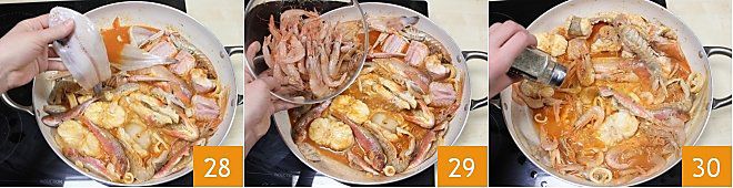 the soles 28, and lastly the prawns 29. Cook for another 10 minutes at most, then salt and pepper 30, and voilà, the Fano-style fish stew is ready! Serve it with toasted bread croutons or slices of fresh bread!