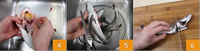 Keep the gurnard whole and gut it under running water 4; Do the same with the hake: open the belly and gut it 5. Then remove the head 6; if very large, cut it into chunks, otherwise leave it whole.