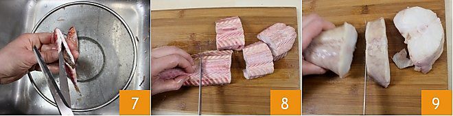 Gut the red mullet as well and leave them whole 7. Now cut both the smoothhound and the monkfish, which are already cleaned in the market, into chunks (8-9).