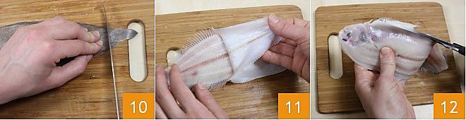 Clean the sole: cut the skin from the tail with a knife 10 and pull it off with force 11 from both sides. Use scissors to remove the outer bones 12. For further details, see the Cooking School: cleaning sole.