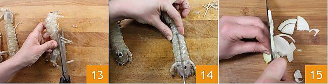 Finally, take care of the crustaceans: remove the legs from the mantis shrimp and cut them down the middle from the head (13-14). Do the same with the scampi if you want, making it easier to consume once cooked. At this point, proceed with the stew: chop the onion 15 and