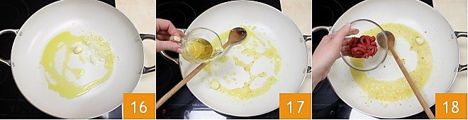 sauté it in plenty of oil with a clove of garlic, which you can leave whole or crush 16, over very low heat for 15 minutes. Deglaze with white wine vinegar (or another mild vinegar) 17, and once the vinegar has evaporated, add the tomato paste 18.