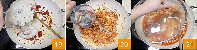 Now that the base is ready, you can add the fish, starting with those that require a longer cooking time: the cuttlefish and squid 19, which you will sauté for about 10 minutes. Then add the hot water 20 (or fish stock or Shellfish Stock if available) and cover with a lid 21.