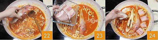 Now add the main fish to the pot: the gurnard 22, the smoothhound 23, the monkfish 24, and finally the hake. Do not stir anymore with a wooden spoon from now on but only shake the pot by the handles.