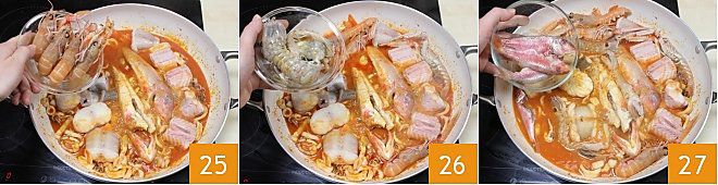 Finally, add the crustaceans and red mullets, which require little cooking time: the scampi 25, the mantis shrimp 26, and the whole red mullets 27,