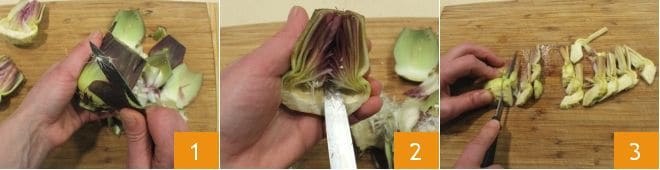 To prepare bucatini with crispy zampone and artichokes, start by cleaning the artichokes (for all details, check our cooking school how to clean artichokes): cut the artichoke stem at the base. With the help of a small knife, remove the tougher outer leaves 1. Cut the artichoke in half and then remove the choke: use a teaspoon to cut around the entire inner perimeter of the artichoke 2. At this point, cut the artichokes into strips 3 and