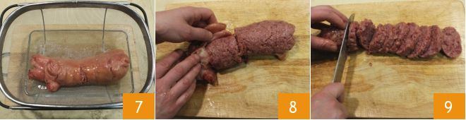 and let it drain in a colander 7. Remove the skin 8 and cut the zampone into slices 9.