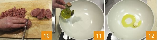 Chop the zampone coarsely 10. Set aside the chopped zampone and place a pan on the heat, pour a drizzle of oil 11, add a clove of garlic 12 and