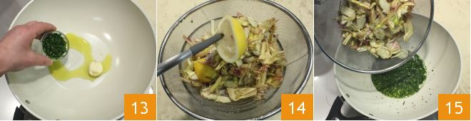 the chopped parsley 13. Drain the artichokes from the water, remove the lemon with a kitchen tongs 14, and add the artichoke strips to the pan 15.