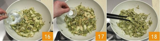 Sauté the artichokes in the pan over high heat for about 10 minutes until they soften, adding 200 ml (about 7/8 cup) of water 16 to prevent them from drying out during cooking. Salt 17, pepper to taste, and remove the clove of garlic 18.