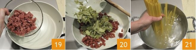 In another pan, add the chopped zampone 19 and cook it over high heat for a few minutes, just enough to make it crispy, then add the sautéed artichokes in the same pan 20 and cook for a few minutes to flavor. Meanwhile, place a large pot of salted water on the heat, bring to a boil, and add the bucatini 21.