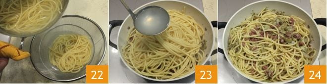 Cook them until they are al dente, drain them, being careful to reserve some of the cooking water 22. Add the pasta to the artichoke and zampone sauce, mix to combine the ingredients, and add a ladle of cooking water 23. Sauté the bucatini with zampone and artichokes in the pan for a minute and then serve them hot 24.
