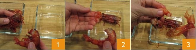 To prepare the buffalo finger bites, start by cleaning the red shrimp: detach the head 1, the legs 2, and the shell, including the tail 3.