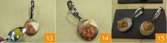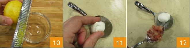 Grate the lemon zest and collect it in a small bowl 10. Everything is ready to assemble the buffalo and shrimp finger bites: take an appetizer spoon and place a buffalo bite on top 11, then add the shrimp on top 12.