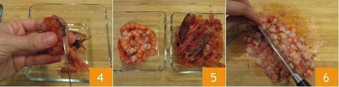 Make an incision along the back with a small knife and remove the intestine, which is the black string 4. Once the shrimp are cleaned 5, chop them with a knife without over-chopping 6.