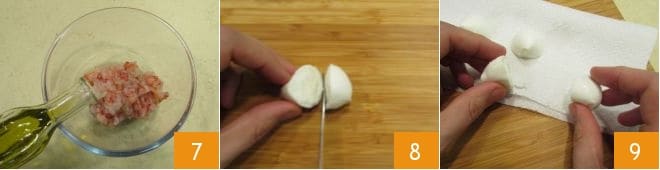 Place them in a bowl and dress with olive oil 7, salt, and pepper. Wash and dry the basil, cut it into thin strips, and add it to the bowl, stirring to season. Now drain the buffalo bites from their preserving water, cut them in half 8, and gently pat them dry with a kitchen towel 9.