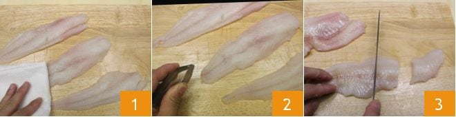 To make the fish burgers, start by cleaning the cod fillets: rinse them under running water, pat them dry with a kitchen towel 1, and remove any bones with kitchen tweezers 2. Cut the fillets into pieces 3