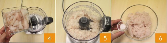 and place them in the mixer 4, chop the cod until you obtain a smooth mixture 5. Transfer the mixture to a bowl and season with salt 6,