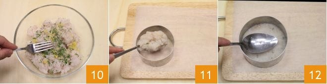 mix everything well with a fork 10. Place a sheet of parchment paper on a cutting board and start creating the fish burger. Use a spoon to distribute the cod mixture inside a 2.75-inch diameter round cutter 11 and press it with the back of the spoon 12 so that the mixture takes the shape of the cutter.